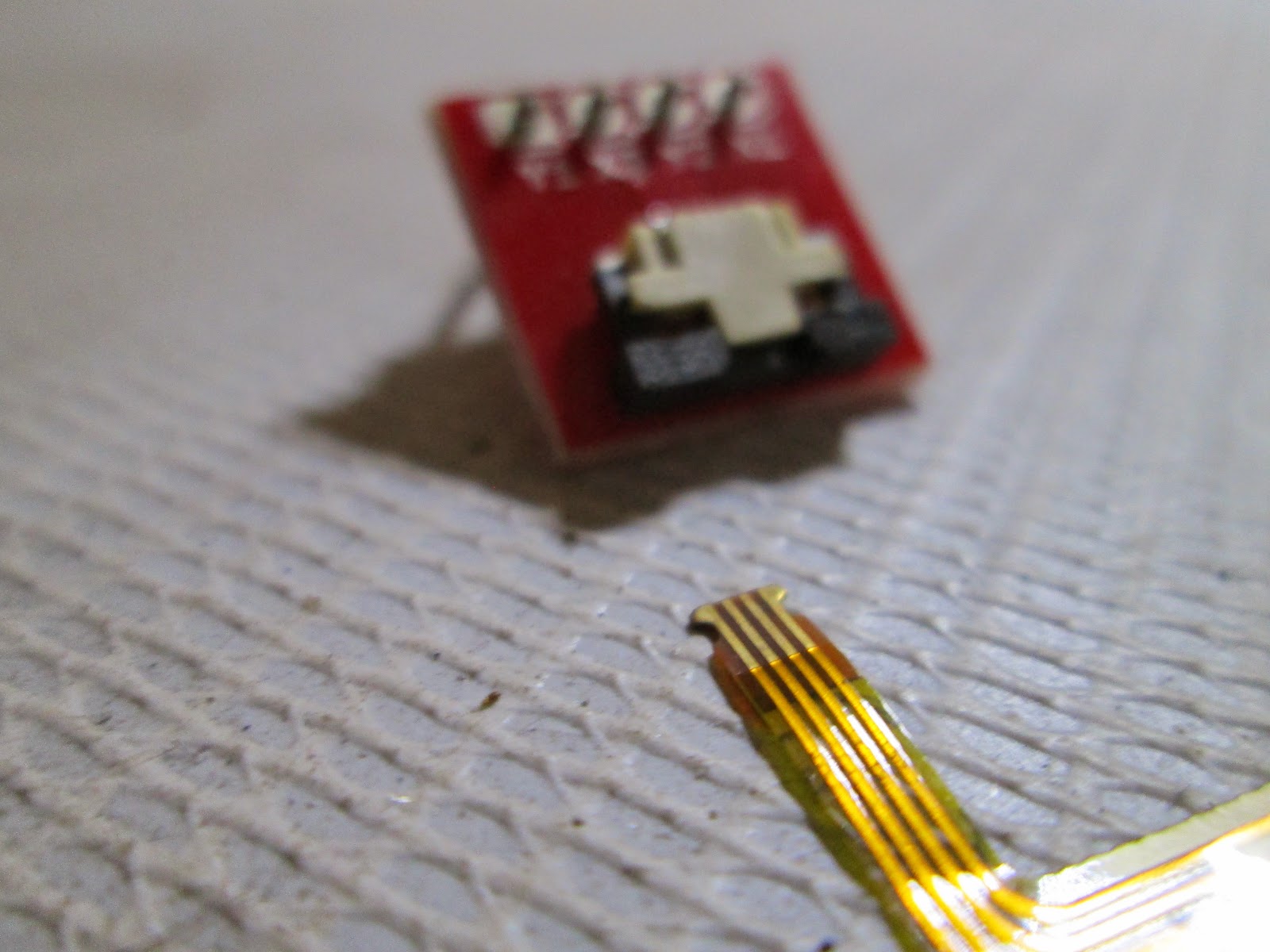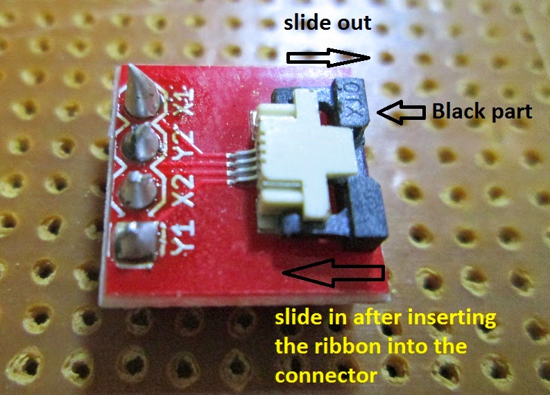Next, you need to slightly slide out the black part of the breakout board connector. Insert the ribbon cable inside the connector and then slide back the black part to get a firm connection.