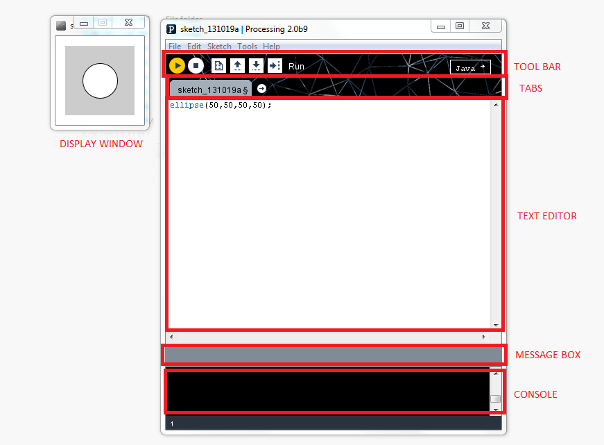 Launch the software and now what you see is the Processing Development Environment. And yes it looks like a color changed Arduino IDE. It consists of a text editor, a compiler, and a display window