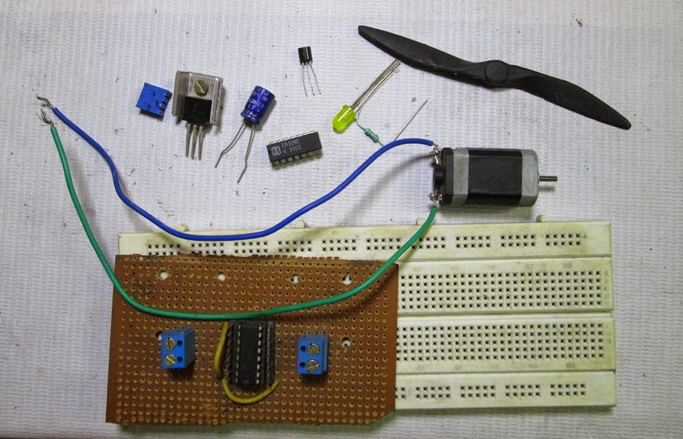 -Now assemble the other components as per the given circuit. Connect the propeller to the motor axle to make the fan.